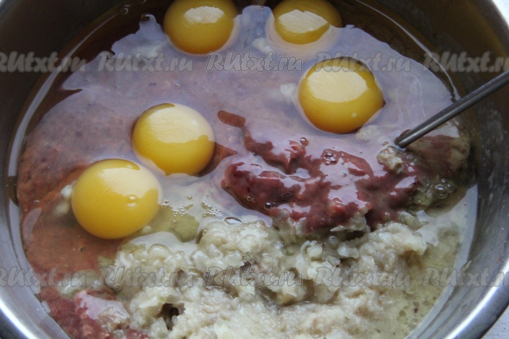К печёнке и луку добавить яйца, муку, посолить, поперчить, тщательно перемешать. Тонкой струйкой влить молоко.