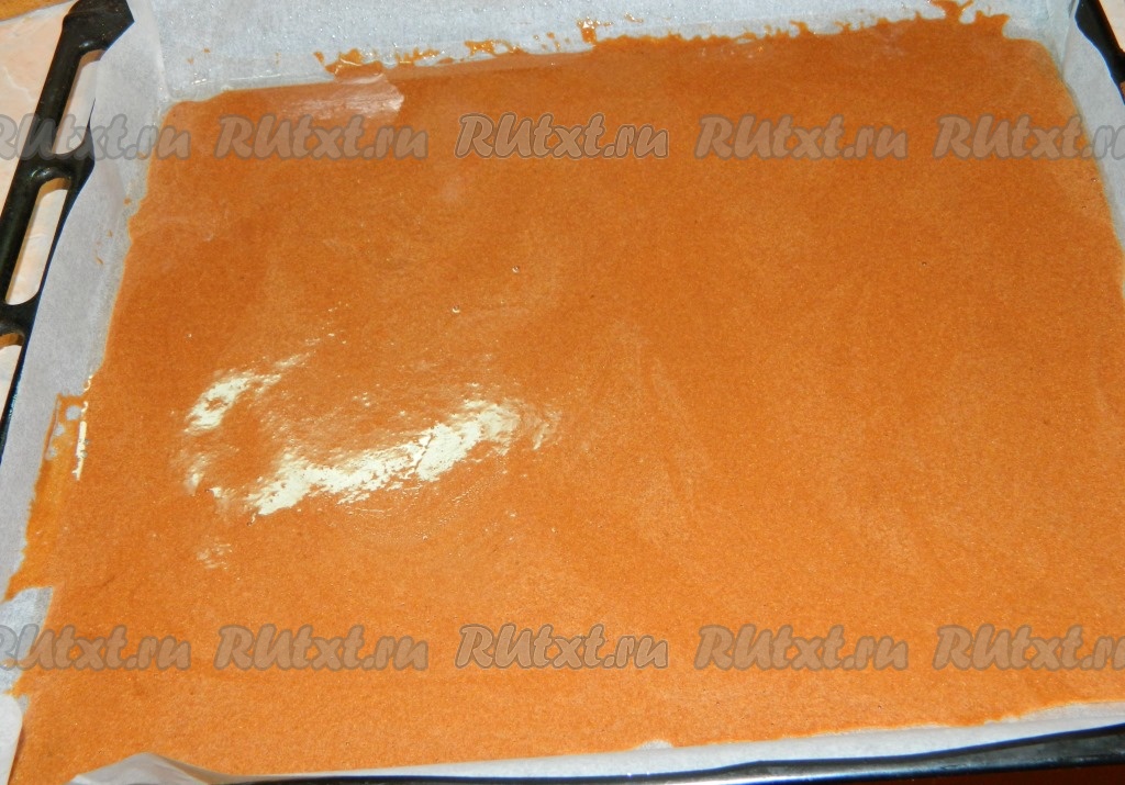 Вылить тесто на противень, застеленный бумагой для выпечки. Равномерно распределить тесто по всей форме (у меня размер противня 30х25 см), поставить на 5-7 минут в духовку, разогретую до 180 градусов. Готовый бисквит переложить на стол, накрыть мокрым полотенцем и оставить до остывания.