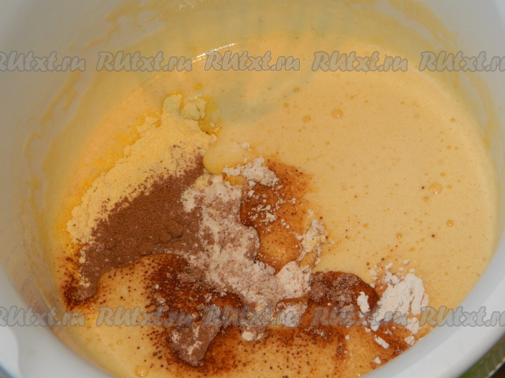 Взбить яйца с сахаром. Добавить пшеничную и кукурузную муку, какао и соду. Влить горячую воду и перемешать аккуратно до однородной массы.