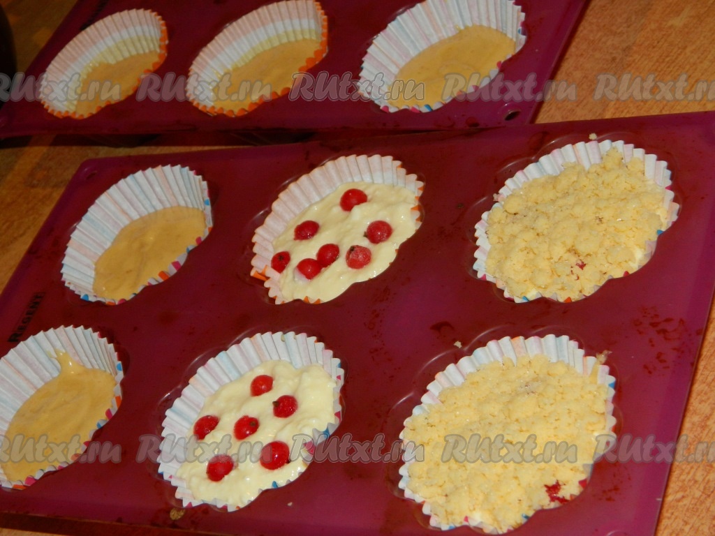 Формы для выпечки маффинов смазать растительным маслом или вставить специальные бумажные вкладыши. В формочки сначала выложить тесто, заполняя каждую формочку на 1/3 объёма. Затем положить творожную начинку (тоже, заполняя формочки на 1/3 объёма). По желанию разложить на творог ягоды смородины (замороженные ягодки можно не размораживать). Посыпать сверху маффины штрейзелем. Слегка прижать рукой штрейзель. Выпекать кексы в разогретой до 180 градусов духовке 30-40 минут.