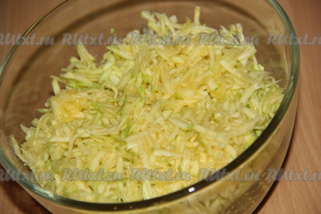 Кабачки, натёртые на крупной тёрке, слегка посолить и оставить на 10-15 минут.