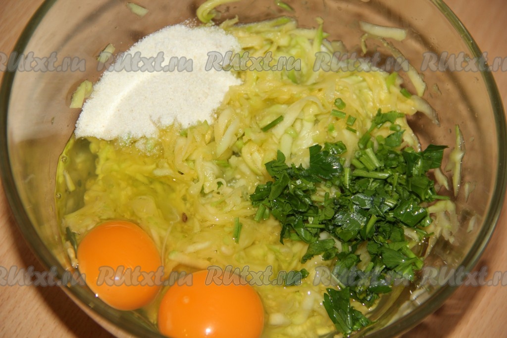По истечении времени хорошо отжать мякоть кабачков от лишней жидкости. Добавить к кабачкам яйца, мелко рубленную зелень и манку. Всё хорошо перемешать.