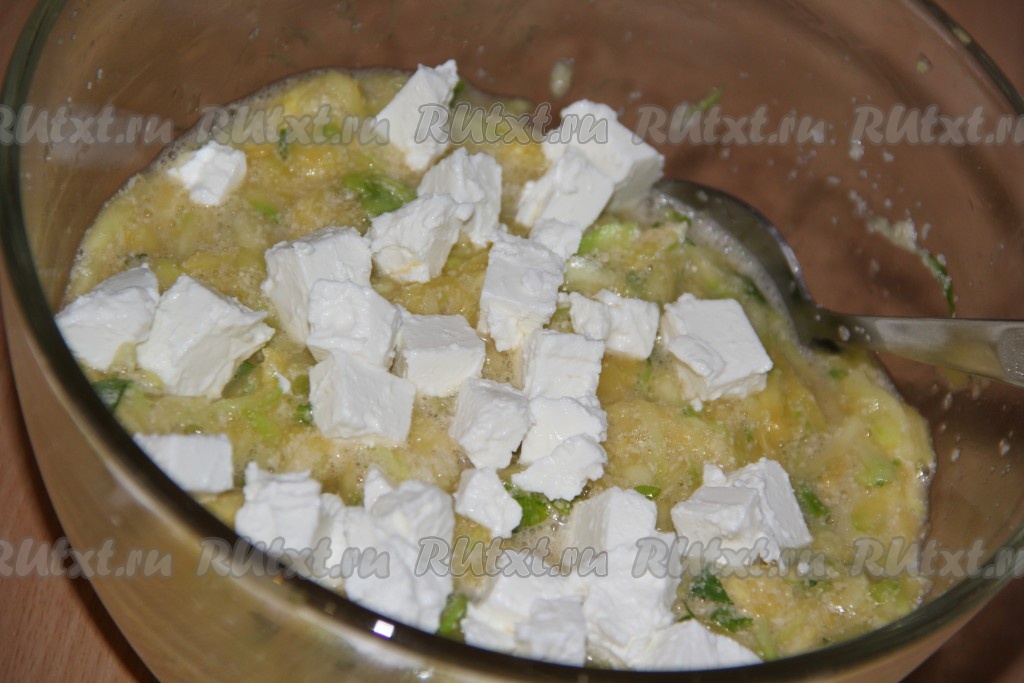 Далее всыпать муку и хорошо перемешать. К полученной массе добавить кусочки брынзы и аккуратно перемешать.