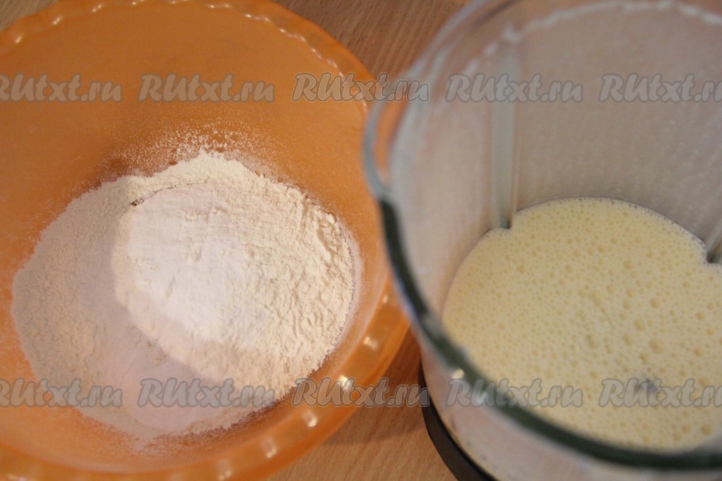 Влить жидкую смесь в муку и перемешать венчиком до однородного состояния. Смесь получится не густой.