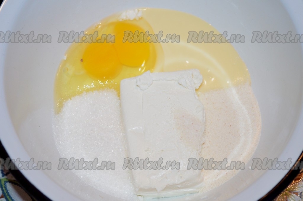 Творог, яйцо, сгущенку, сахар, разрыхлитель и манку сложить в миску.