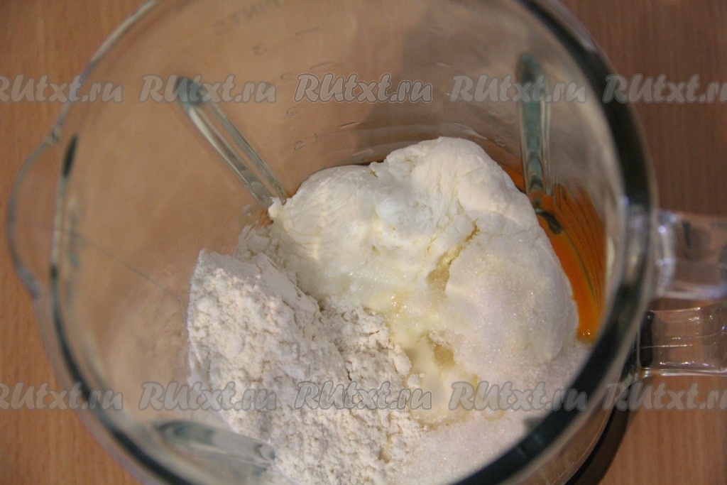 Для приготовления заливки в чашу блендера поместить творог, яйцо, йогурт, сахар, ванильный сахар, муку и тщательно взбить до однородной массы.