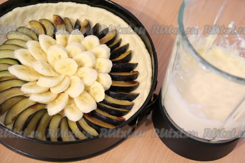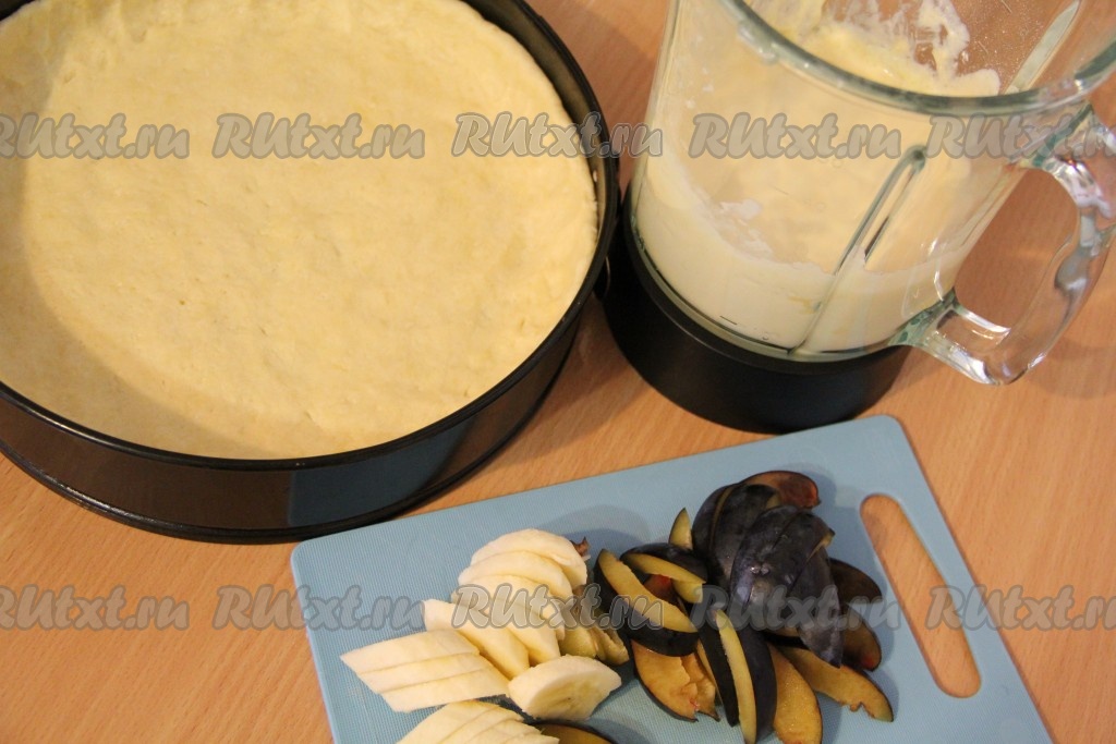 Охлажденное тесто достать из холодильника, немного раскатать и выложить в форму, формируя бортики (я использовала разъёмную форму диаметром 22 см). Очищенные бананы нарезать колечками, сливы вымыть, очистить от косточек и нарезать дольками.