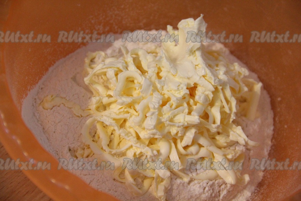 Просеянную муку, разрыхлитель и соль насыпать в глубокую миску, добавить натёртый на крупной тёрке или порубленный на мелкие кусочки маргарин. Перетереть маргарин с мукой в крошку.