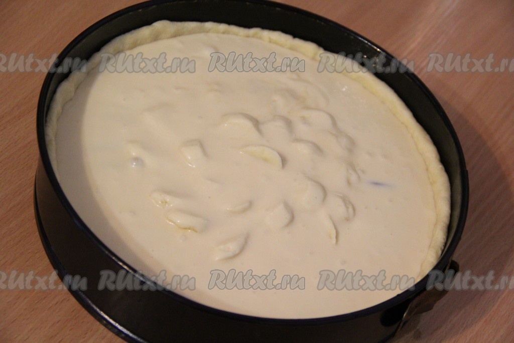 Аккуратно залить фрукты творожной заливкой. Поставить форму в разогретую духовку и выпекать пирог при температуре 180 градусов 1 час.