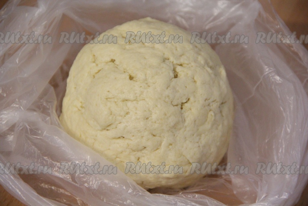 В получившуюся крошку добавить сметану и заместить не липнущее к рукам, эластичное тесто. Из теста скатать шар, завернуть в пищевую плёнку и убрать минут на 30 в холодильник.
