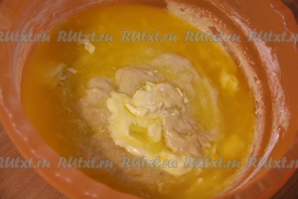 Затем влить растопленный маргарин и ещё раз перемешать.