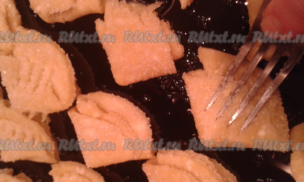 Выложить на противень, смазанный подсолнечным маслом, сахарной стороной вверх. Надавить вилкой, чтобы сделать лапки.