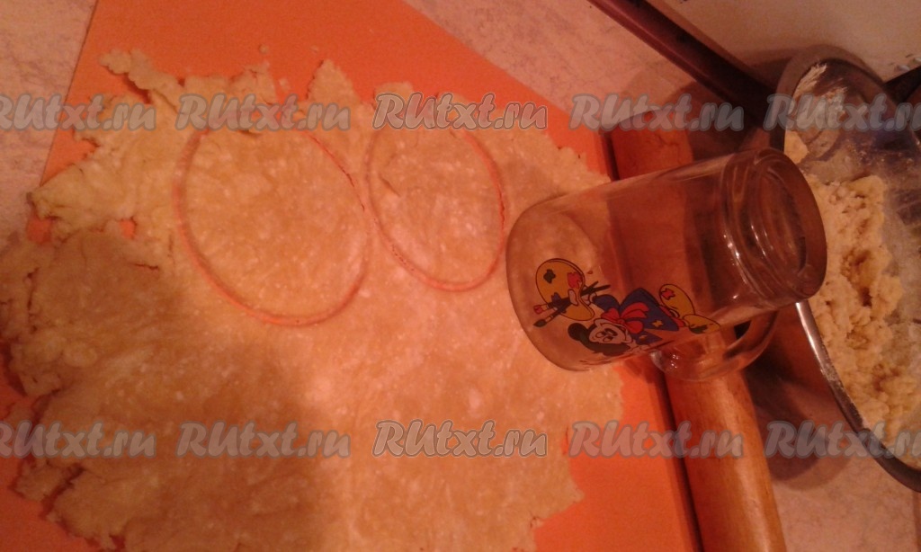 Добавить муку. Замесить тесто. Раскатать, вырезать кружочки.