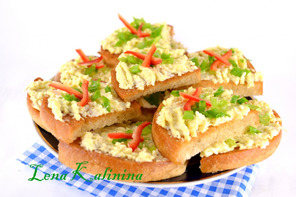 Натереть поджаренную сторону каждой гренки чесноком и смазать подготовленной сырно-яичной массой. Украсить готовые бутерброды можно зеленью и кусочками красного болгарского перца.