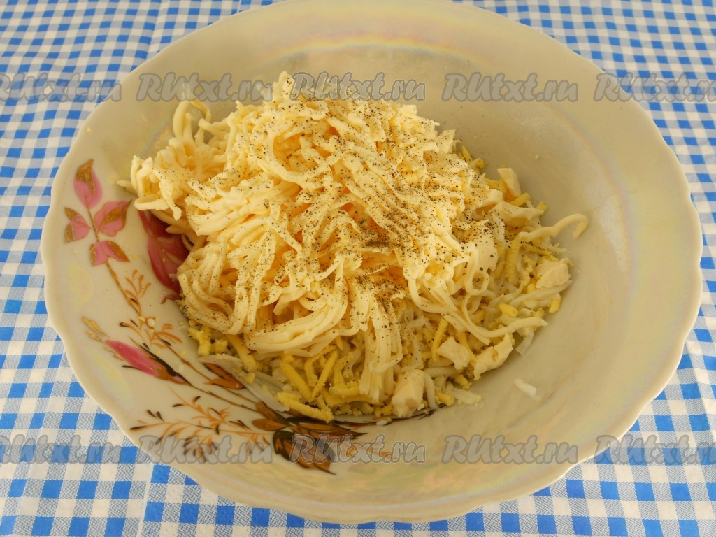 Я готовила эти бутерброды с плавленным сырком, поэтому натёрла его на крупной тёрке и добавила к натёртым яйцам. Если вы берёте пастообразный плавленный сыр, тогда просто выложите 100 грамм сыра к натёртым яйцам. Посолить и поперчить смесь яиц и сыра.