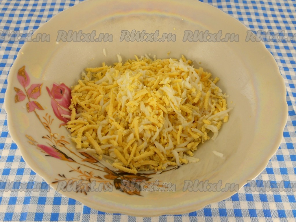 Яйца отварить вкрутую (варим 10 минут с момента закипания), остудить, очистить и натереть на крупной тёрке.