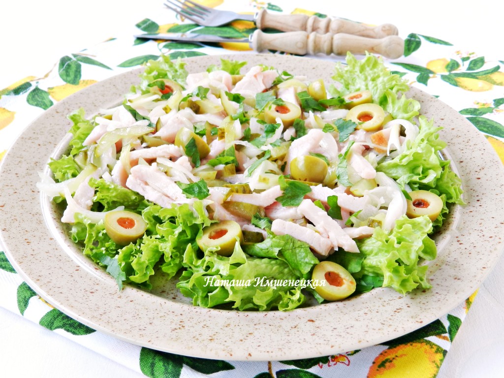 Выложить салат из мяса, огурцов и лука вместе с маринадом на промытые и обсушенные листья салата. Добавить разрезанные пополам оливки и рубленную петрушку.