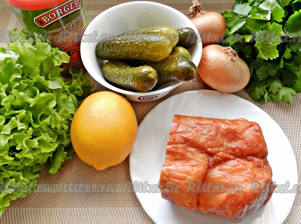 Подготовить ингредиенты для приготовления салата с копчёным мясом и огурцами.