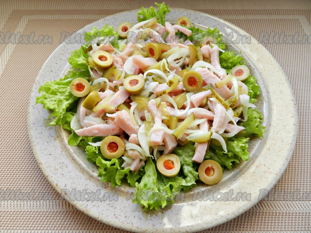 Салат, приготовленный с копчёным мясом и огурцами, получается очень вкусным, свежим и красивым. Этот пикантный салатик можно подать к семейному обеду или к праздничному столу. В состав этого салата входят оливки, но если вы их не любите или их нет в наличии, тогда можно обойтись и без них.