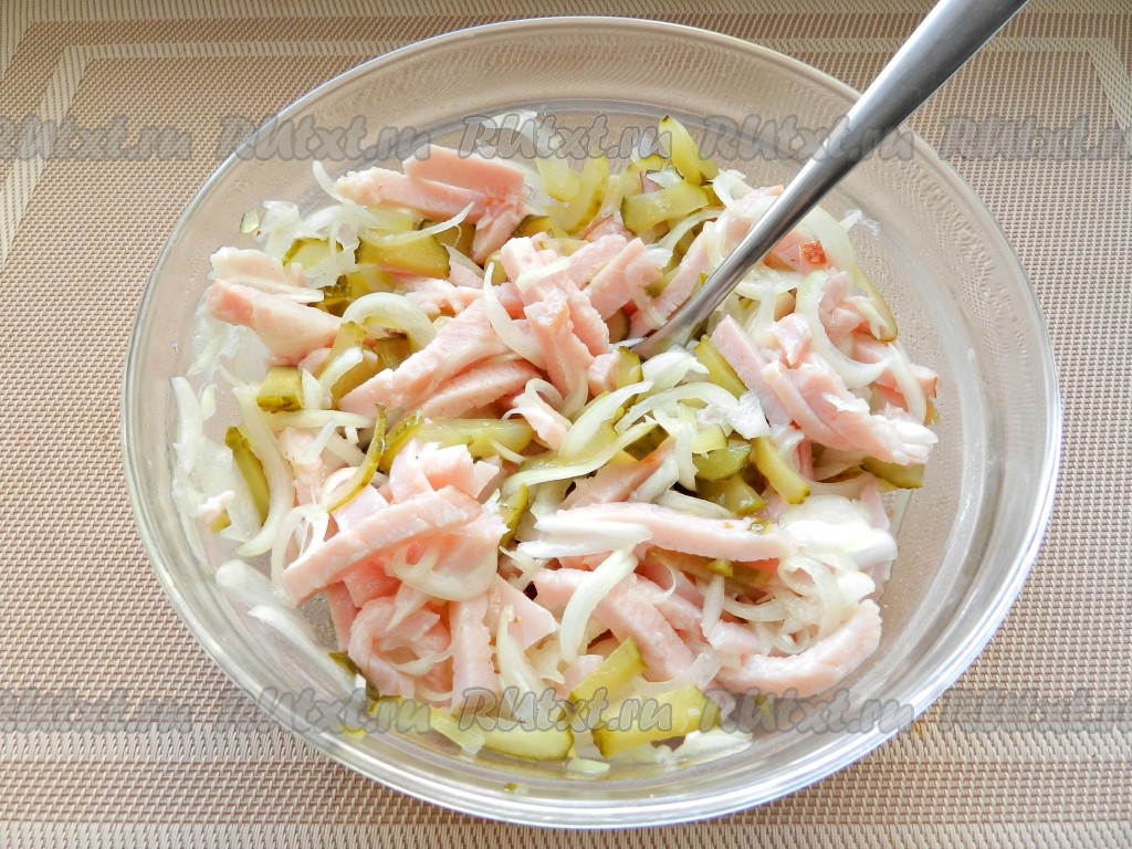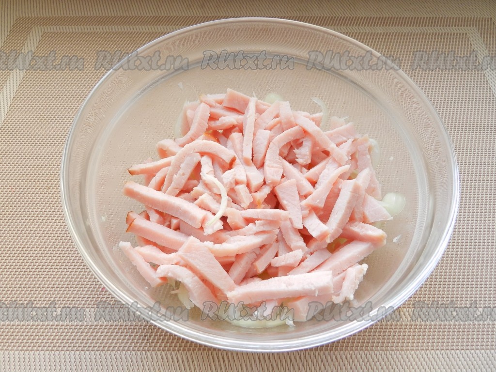 Копчёное мясо нарезать соломкой и выложить к луку.