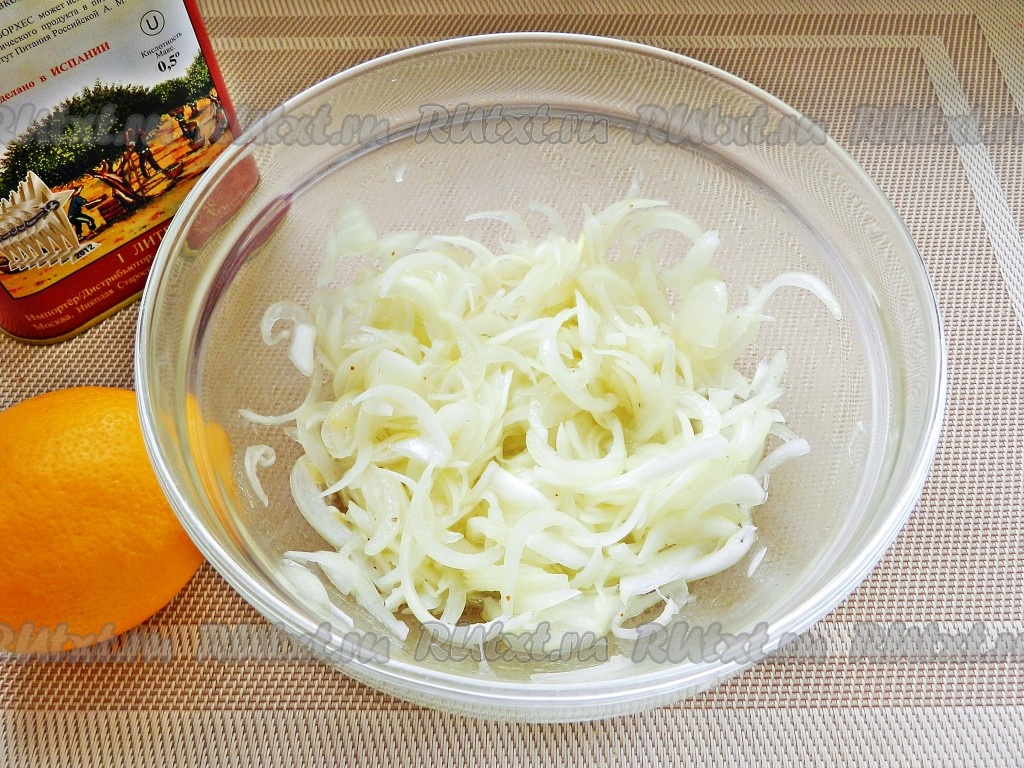 Лук очистить, нарезать тонкими полукольцами, добавить сахар, немного черного молотого перца, лимонный сок и оливковое масло, перемешать и оставить на 5-7 минут.
