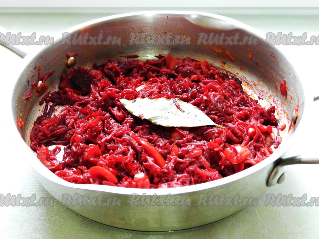 Приготовить заправку для борща. Овощи очистить. Лук и болгарский перец нарезать, морковь и свеклу натереть на крупной терке. Разогреть растительное масло. Обжарить в сковороде сначала лук и морковь до мягкости, затем добавить болгарский перец и немного обжарить все вместе. Затем добавить свеклу, все перемешать, приправить солью, перцем, добавить пропущенный через пресс чеснок и лавровый лист. Обжарить все вместе примерно 5-7 минут. Томатную пасту развести в 50 мл воды и добавить в сковороду. Тушить заправку для борща на медленном огне под крышкой до мягкости овощей около 20 минут.