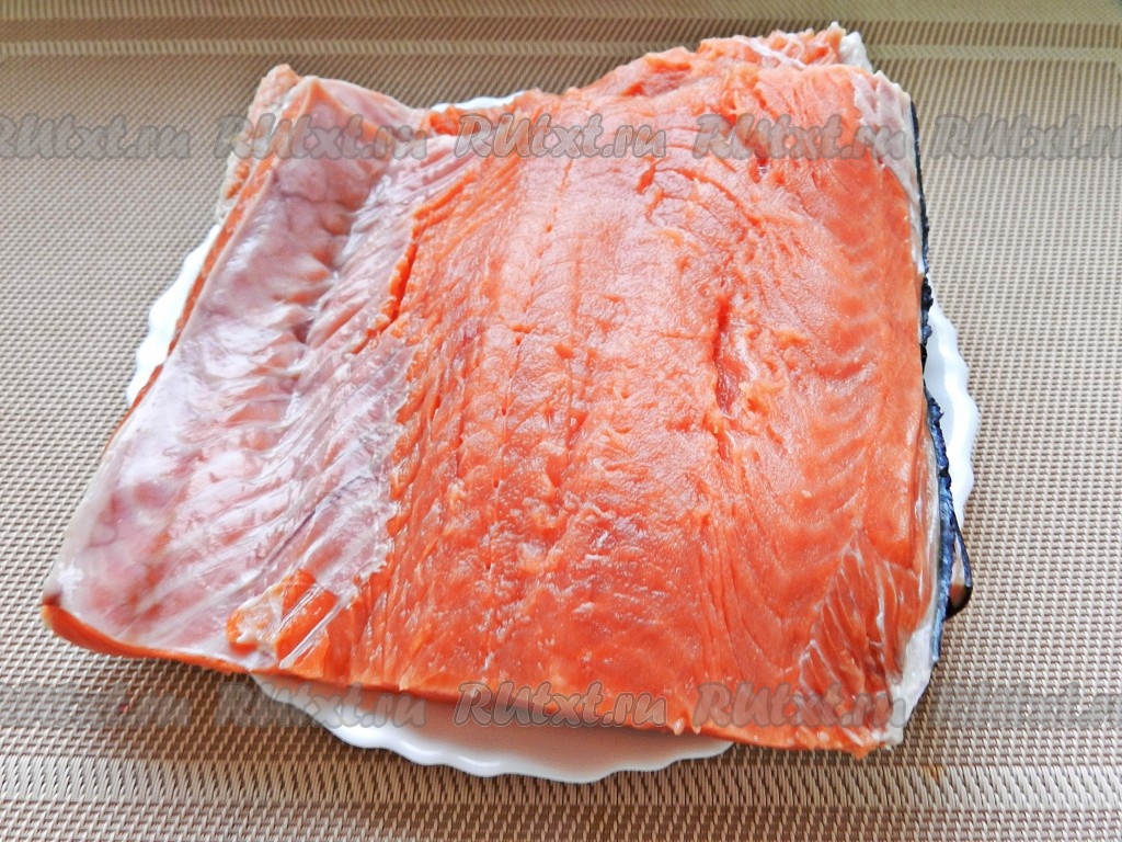 Рыбу очистить, удалить плавники, вырезать хребет и оставить филе на коже.