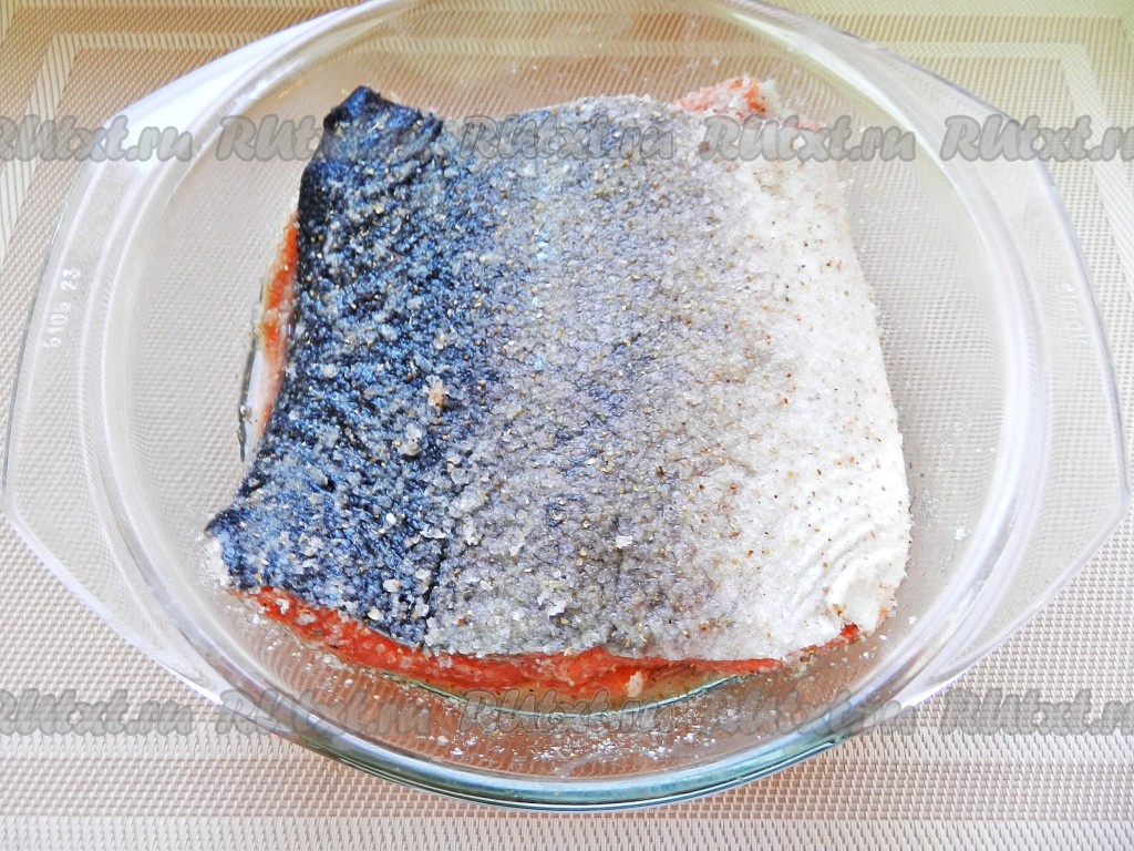 Со всех сторон натереть кижуч этой смесью, положить в стеклянную емкость и оставить на 1-1,5 суток в прохладном месте. В процессе засолки один раз рыбу перевернуть.