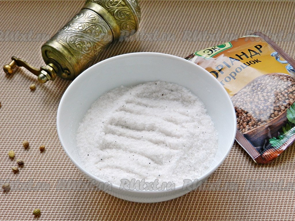 Смешать соль, сахар, перец и молотый кориандр.