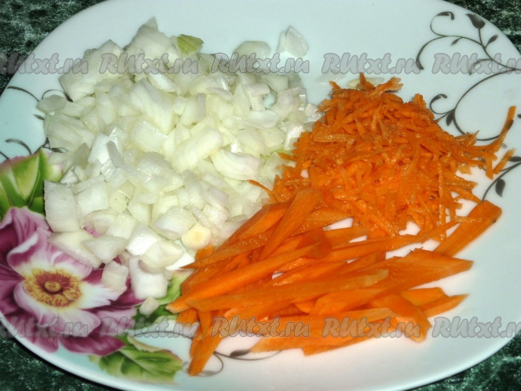 Очищенный лук измельчаем. Часть очищенной моркови натираем на тёрке, часть нарезаем тонкими пластинками.