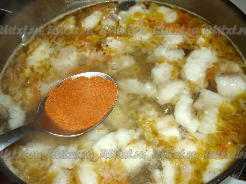 Содержимое сковороды перекладываем в кастрюлю, солим суп из пангасиуса по вкусу,