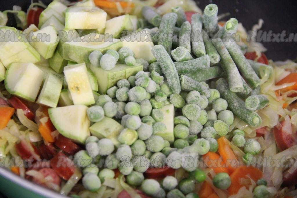 Кабачок нарезать на средние кусочки. Перец очистить от семян, нарезать средними кубиками. Добавить кабачок, фасоль, перец и горошек к овощам с колбасой. Всё хорошо перемешать и тушить под крышкой 5-7 минут, периодически помешивать.