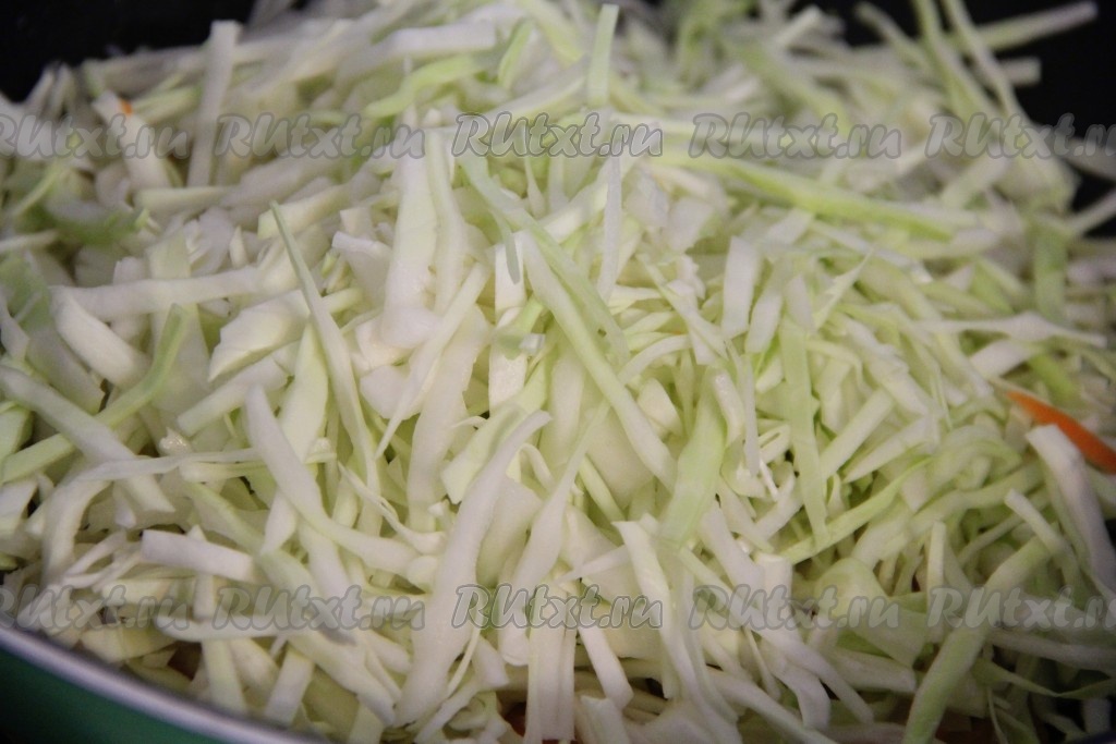 Капусту тонко нашинковать, выложить к овощам, хорошо перемешать. Тушить под крышкой 5-7 минут, периодически помешивать.