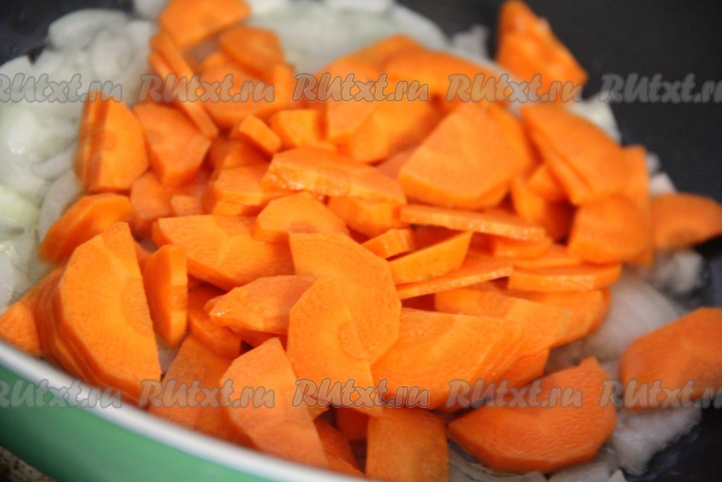 Морковь почистить нарезать кружочками или полукружочками. Выложить в сковороду и обжарить вместе с луком, периодически помешивая, в течение 2 минут.