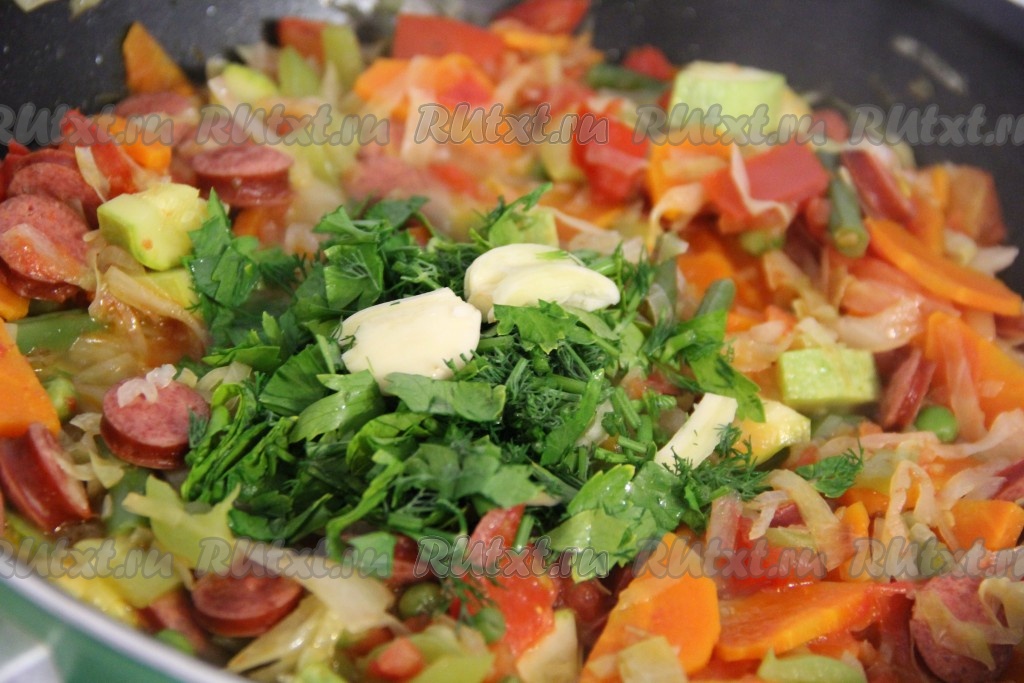Зелень вымыть, мелко нарезать. Чеснок почистить, раздавить ножом. Добавить зелень и чеснок к овощам, всё хорошо перемешать. Закрыть овощное рагу с колбасой крышкой и снять с огня. Дать настояться минут 15.