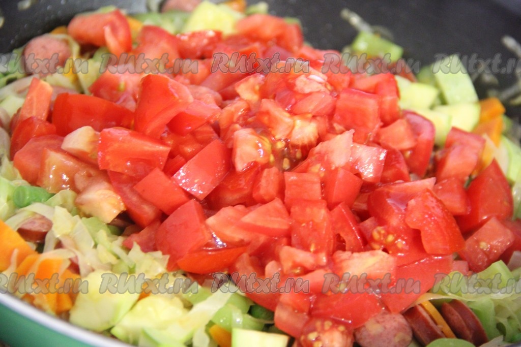Колбасу нарезать на кружочки, добавить к овощам, хорошо перемешать и тушить под крышкой 5 минут.
