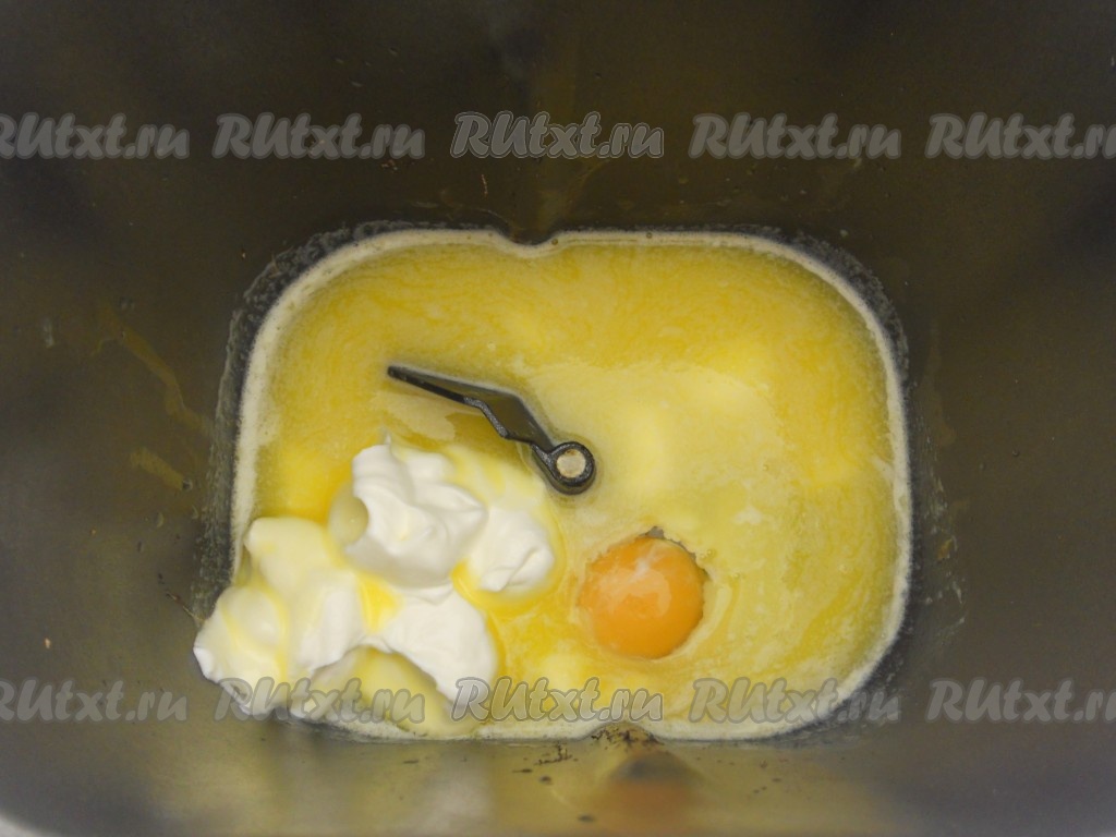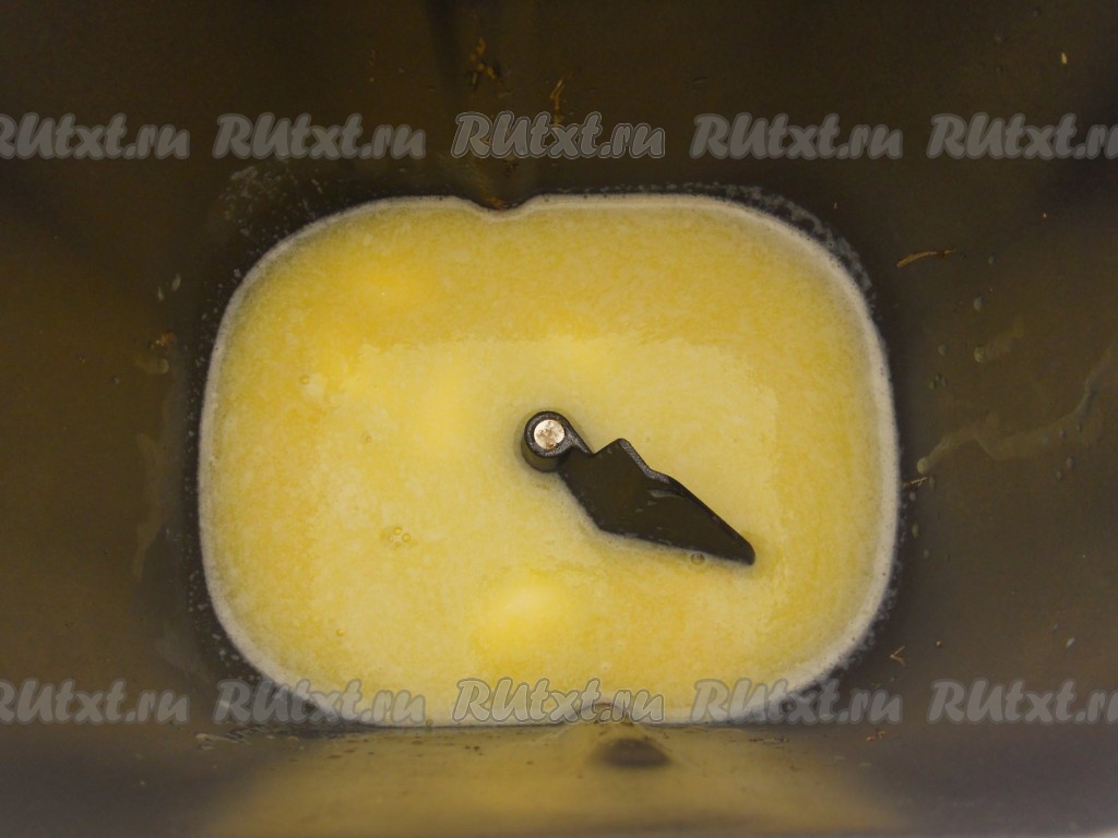 Маргарин растопить, немного остудить и вылить в ведерко хлебопечки.