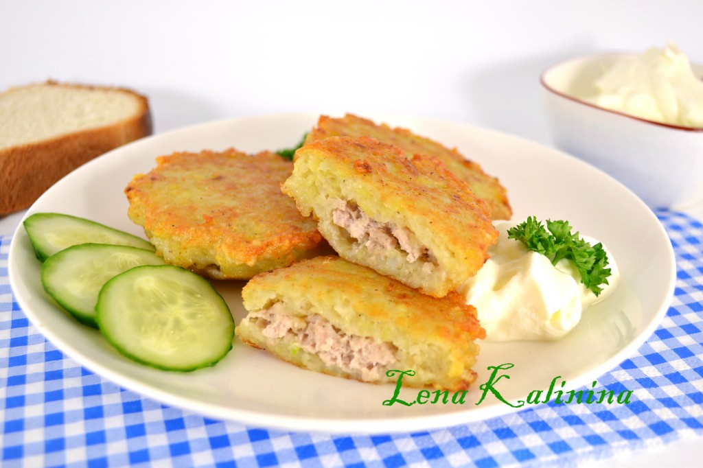 Разогреть сковороду с растительным маслом (масла должно быть на 1/3 сковороды). Выкладывать картофельное тесто ложкой в виде круглых оладий (разровнять, чтобы не были слишком толстыми). На оладьи выкладывать по 1 столовой ложке мясного фарша.