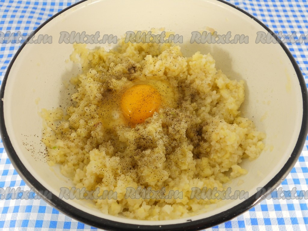 Картофель очистить, порезать на части и перекрутить на мясорубке с мелкой решеткой. Отжать и слить жидкость. Посолить и поперчить по вкусу, добавить яйцо.