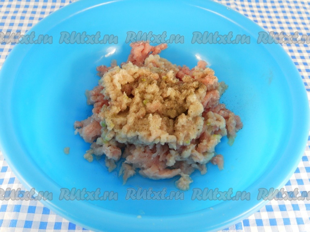 К фаршу добавить перекрученный на мясорубке или натертый на терке репчатый лук, посолить, поперчить. Влить немного воды, чтобы фарш был и не густым, и не жидким.