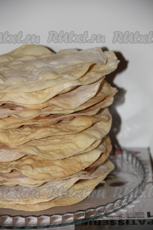 Полученное тесто разделить на 20 частей. Каждую часть раскатать в круг диаметром 24 см. Коржи получаются тонкими, как пергаментная бумага. С помощью тарелки такого же диаметра, как корж, обрезать края и наколоть корж вилкой. Запечь коржи в духовке примерно по 1-2 минуте при температуре 200 градусов, в зависимости от духовки. Выпекать на противне или на пергаментной чистой бумаге. Таким образом выпечь все 20 коржей.
