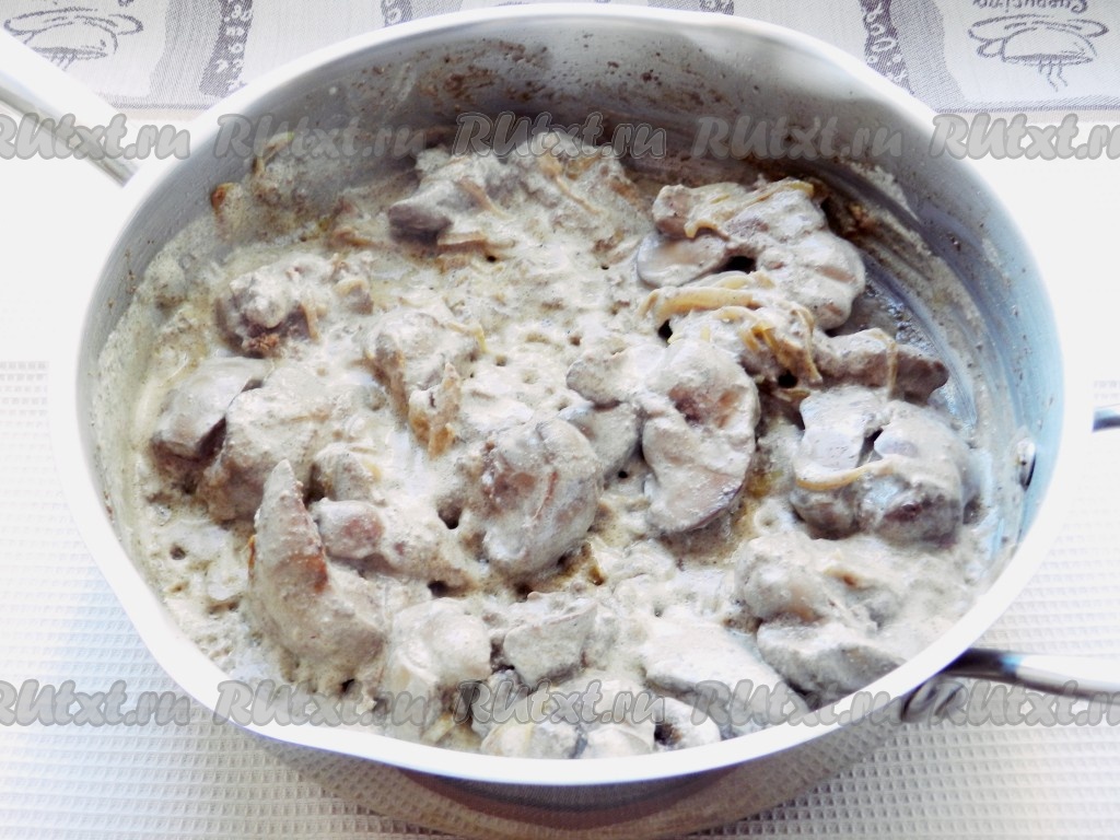 Влить сливки и готовить на медленном огне ещё 5 минут, иногда помешивая. Печень должна остаться мягкой.