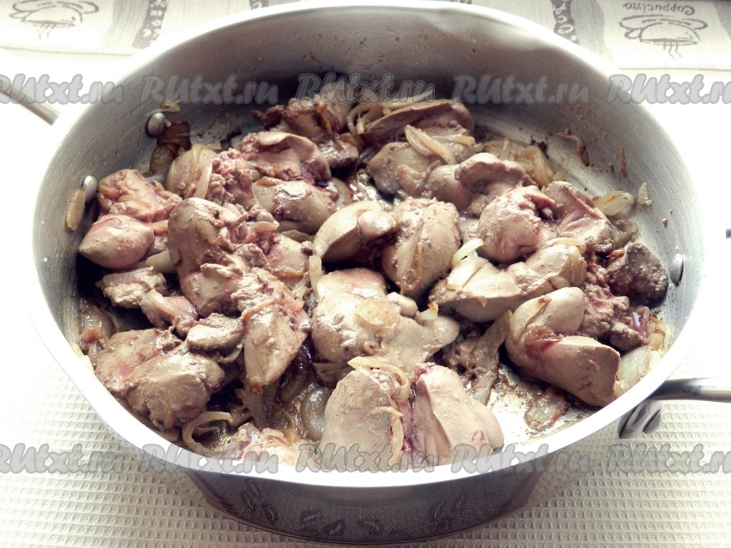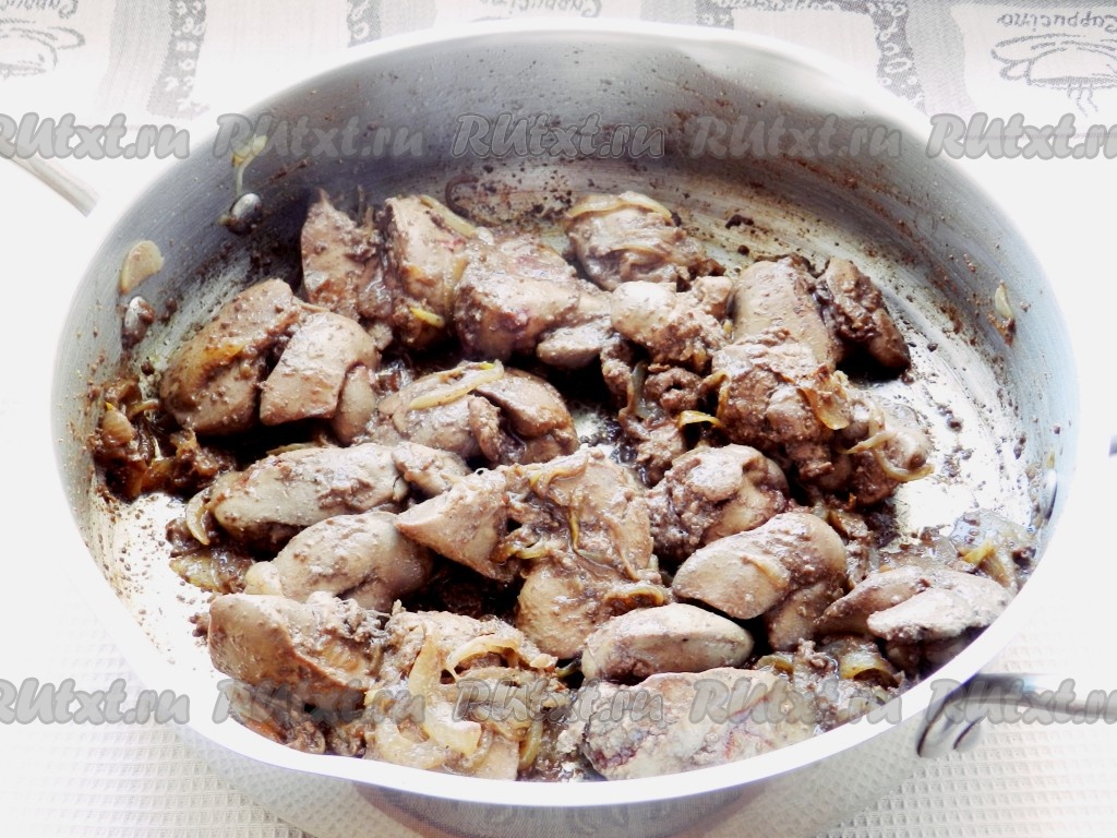 Куриную печень вымыть, удалить плёнки, крупные кусочки разрезать на 2-3 части, затем откинуть на дуршлаг, чтобы стекла вода. Выложить в сковороду к луку печень и обжарить в течение 5-7 минут, периодически переворачивая кусочки.