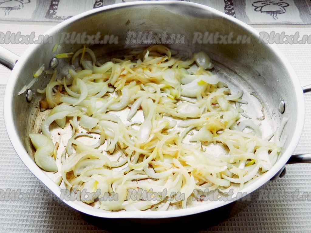 Лук очистить, нарезать (я нарезала на полукольца) и обжарить на растительном масле на среднем огне, помешивая, до золотистого цвета.