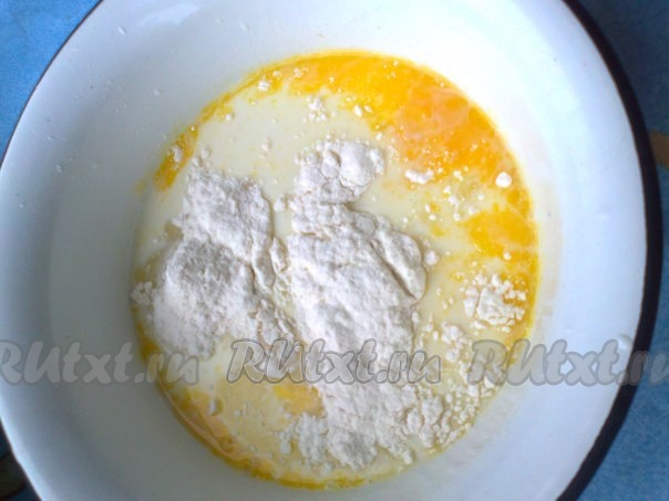 Затем добавьте к молоку качественный картофельный крахмал, соль и сахар, размешайте. Добавьте яйца, снова перемешайте. Теперь, когда молоко ещё достаточно тёплое, добавьте муку и перемешайте.