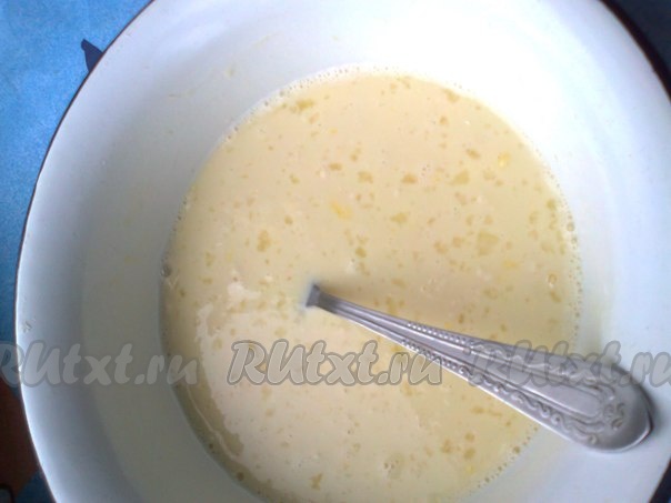 Тщательно вымешайте тесто, чтобы избавиться от комков. Если всё же получились комочки, процедите смесь через сито. Добавьте растительное (или растопленное сливочное) масло, хорошенько размешайте вилкой (или венчиком). В результате у вас должно получиться довольно жидкое тесто.