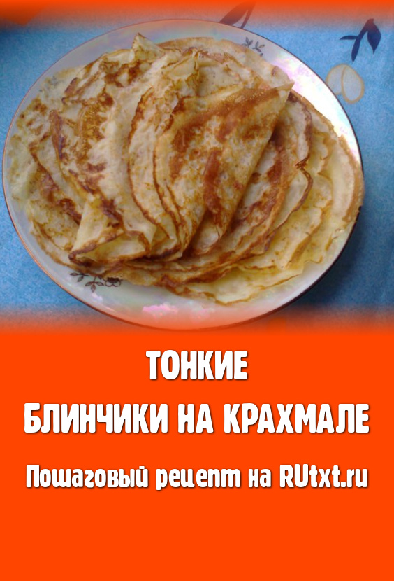 Блинчики, замешанные на крахмале по этому рецепту, получаются просто отличными: очень тонкими, эластичными и вкусными. Готовить их одно удовольствие. Такие блины можно подавать к столу, дополнив сметаной, джемом или мёдом. А ещё в них удобно заворачивать различные начинки (например, творожную). Мне очень нравится готовить блины по этому рецепту, надеюсь такие блинчики понравятся и вам!