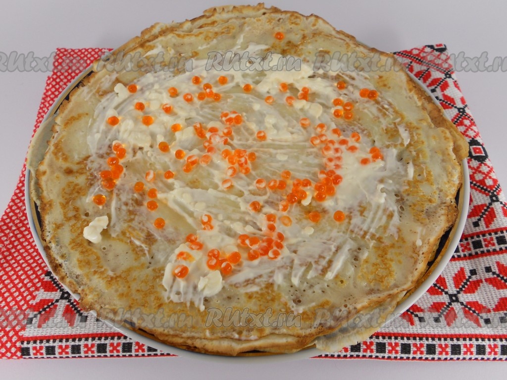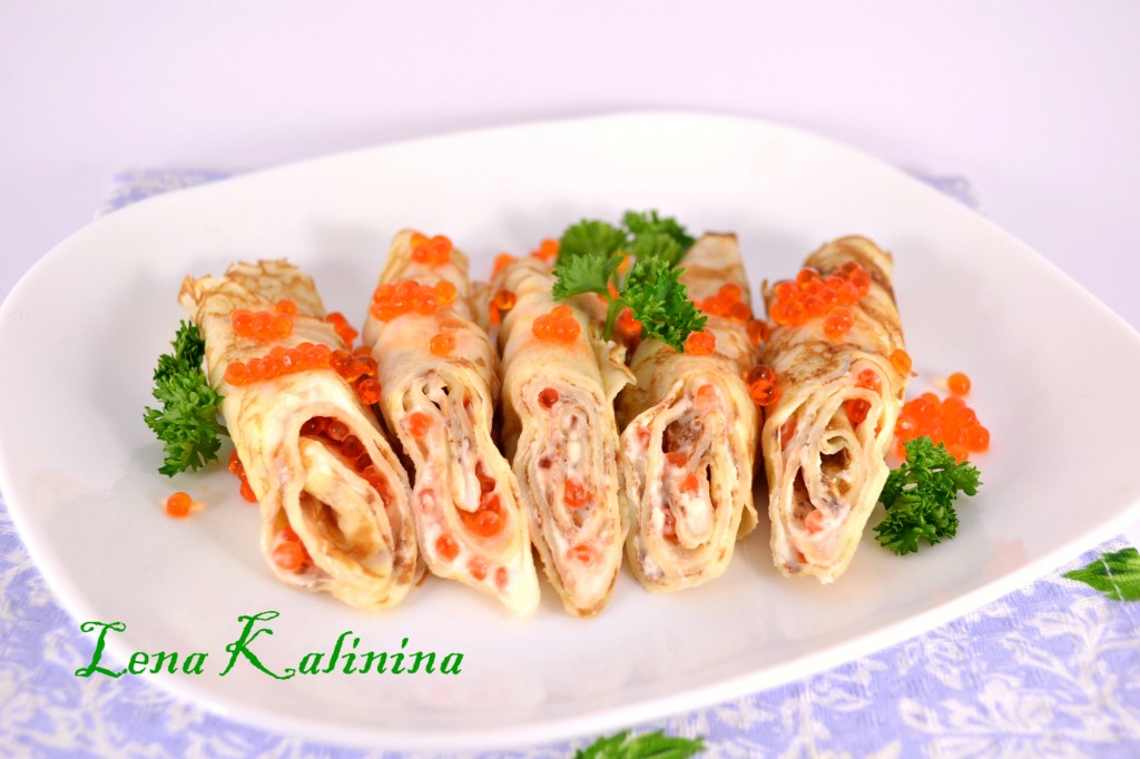 Предлагаю вам замечательный рецепт блинов с красной икрой. Такие блинчики украсят ваш праздничный стол, идеально подойдут для фуршета. Необычайно вкусные, нежные блинчики обязательно придутся по вкусу вам и вашим гостям.