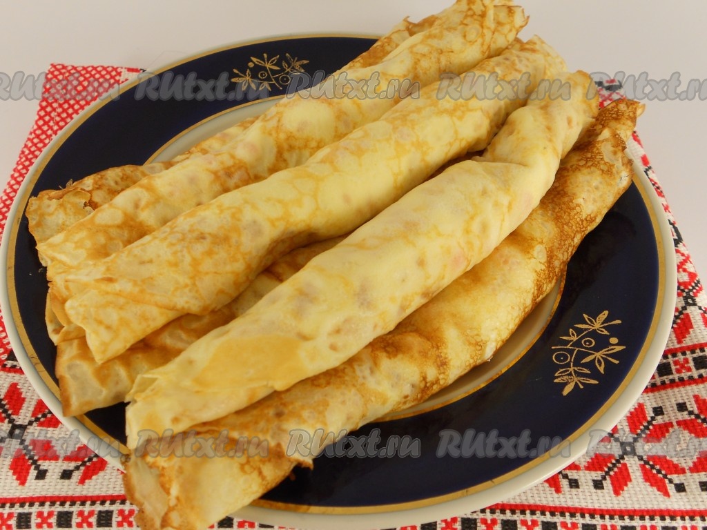 Влить в тесто растительное масло, перемешать. Жарить блинчики на сухой сковороде обычным способом - до румяности с двух сторон. Готовые блины остудить.