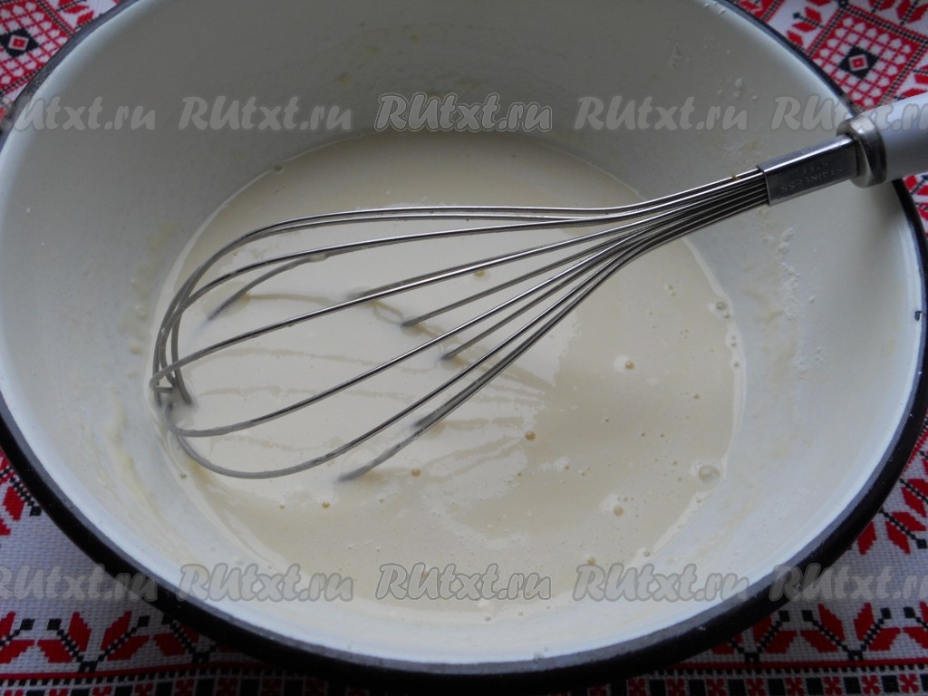 Долить оставшееся молоко, также венчиком хорошенько все взбить. Тесто должно быть жидким.